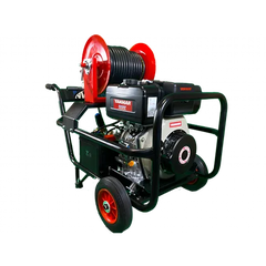 Maxflow cold water pressure washer powered by a Yanmar L100 V spec diesel engine. Featuring a HTD type belt driven premium series Comet pump, this machine produces 15 litres per minute water flow at a pressure of 200 bar. Includes reel, chemical pick up hose complete with filter, and adjustable pressure nozzle for chemical application